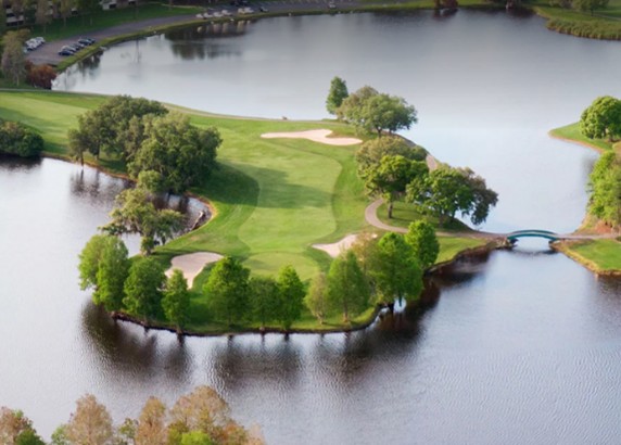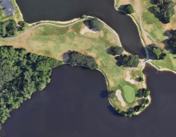 My buddy Rob really pushed us to try the Island. He said it was more challenging than even Copperhead – which was tough. It was indeed tough (70.6/132 from the whites), but I don’t think it was tougher than Copperhead. What Rob didn’t realize is how bad the conditioning was. He played probably two or three years previous and was surprised when we came back with the conditions report. For instance, take a look at the first from above, from the website right and the Google Earth picture left.