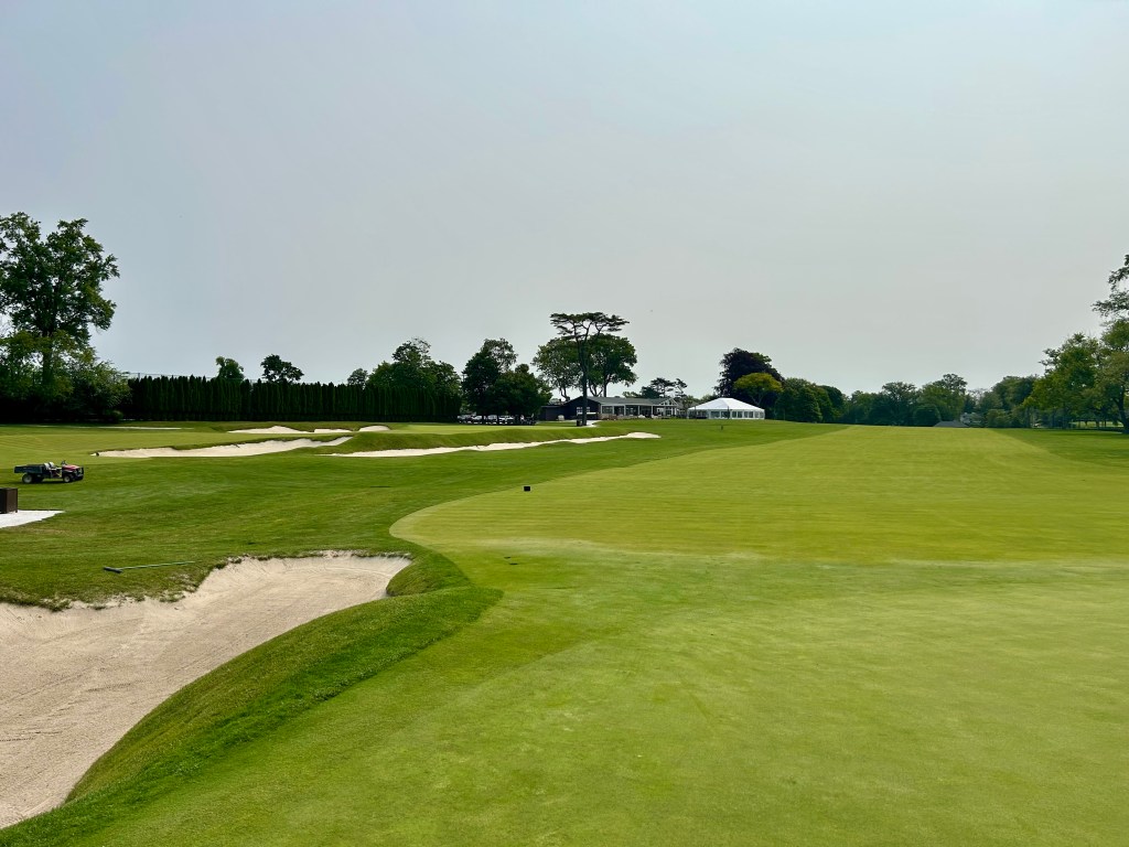 Three from the green looking back at the main clubhouse and tent area. You see how the bunkers can really fuck with you here.