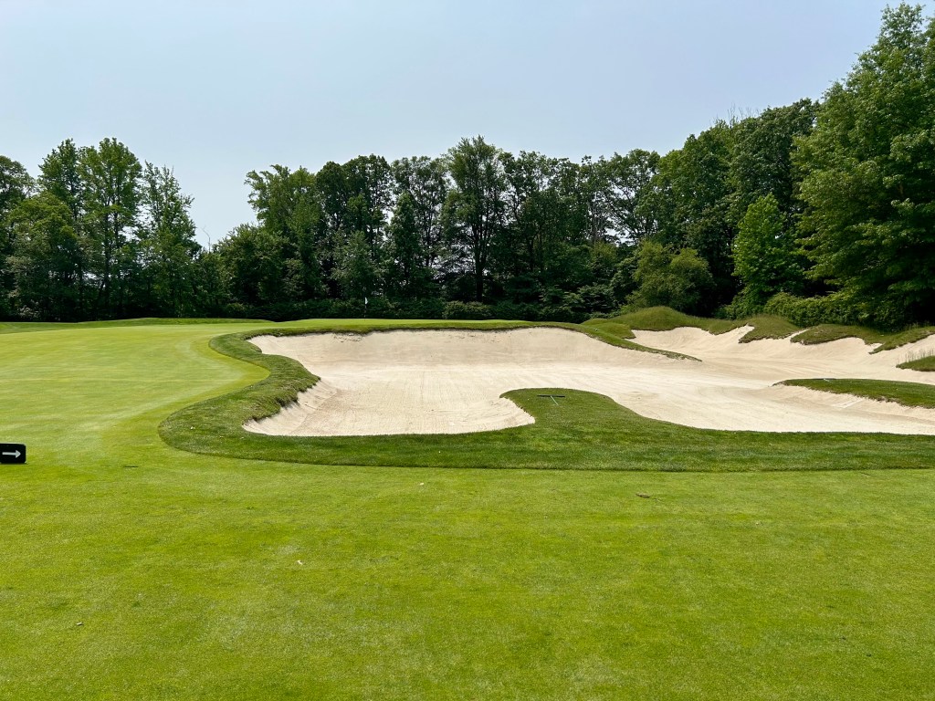 Seven comes back down along six incorporating the same fairway bunker complex as six to the right. This is a legit 520-yard par five that took me four to get on and a two-putt bogey.
