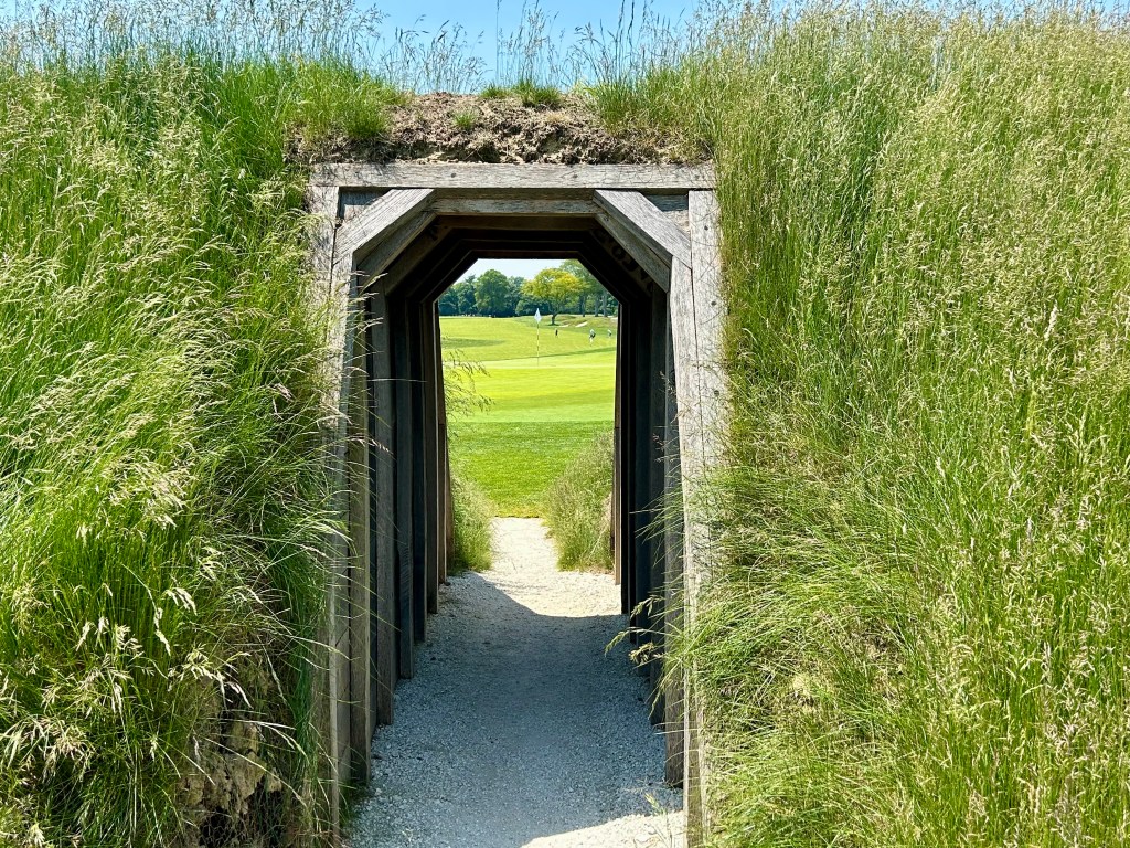 If there is one thing people do know about Hollywood, it’s this door through the dune onto the 17th green. This is a tough par three, 224 yards which means I hit 3-wood, chipped onto the green and was thrilled with a two-putt four.