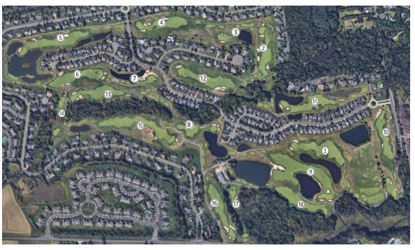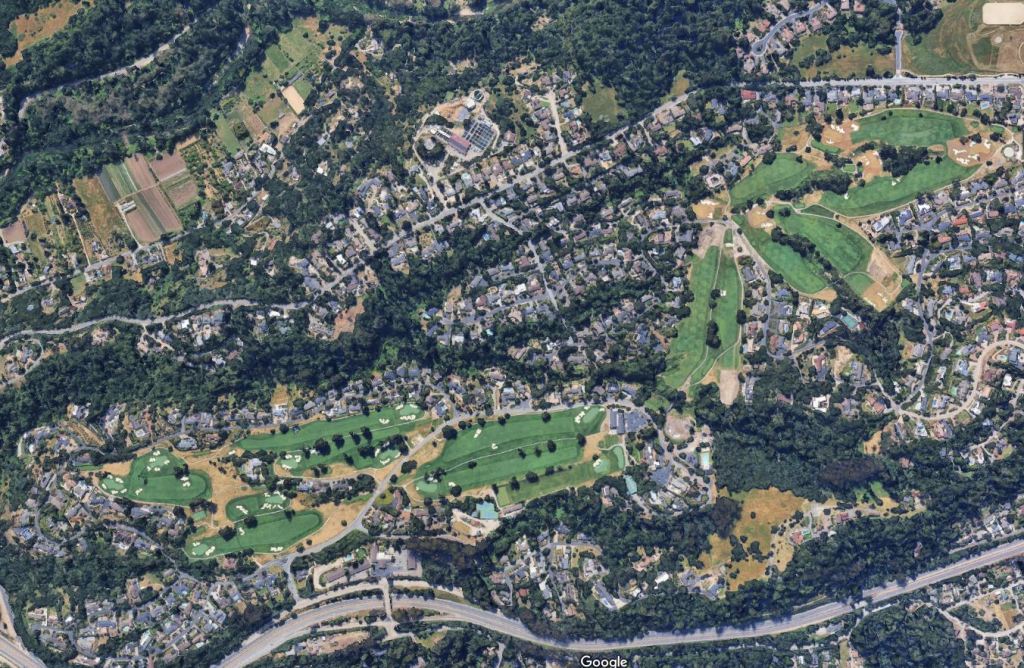 All of this is to say, Laurel Creek loses huge points for being of the planned golf-residential community ilk. The course is good (though with some unfair holes) but the procession of houses drops LC from any consideration in my top area private courses. While I have played pre-planned residential courses just like LC throughout the US, some egregious examples come to mind: Blue Bell CC, PineCrest, RiverCrest (just to name three in the Philly area), Ironhorse in West Palm, St. Andrews in Boca and a lot of the FL area courses. There’re a lot more if I went through my list. Even Pasatiempo loses points for me for the encroaching houses – look at the below satellite image!!!