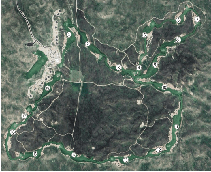 Super surprised GrayBull was laid out on Google Maps being so new so I have a pretty good routing map above for you. The entire course sweeps clockwise across a huge swath with a halfway shack on the third and ninth holes.