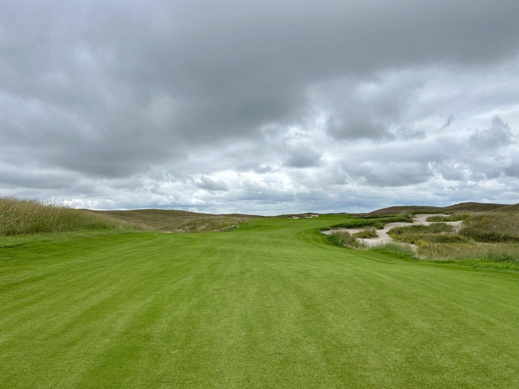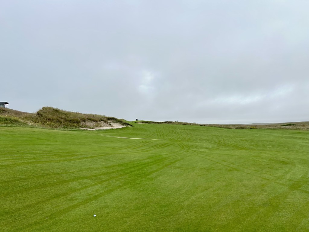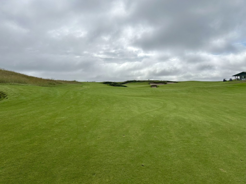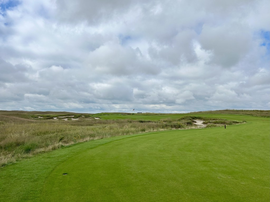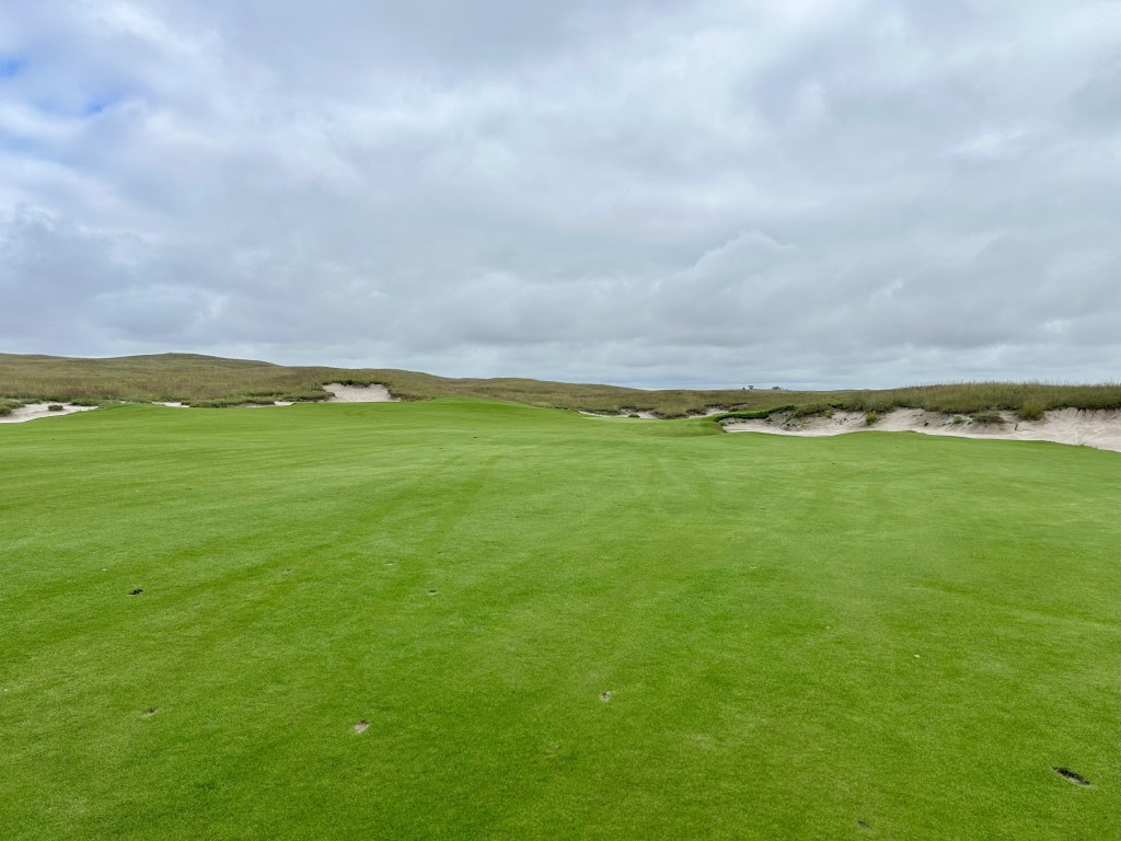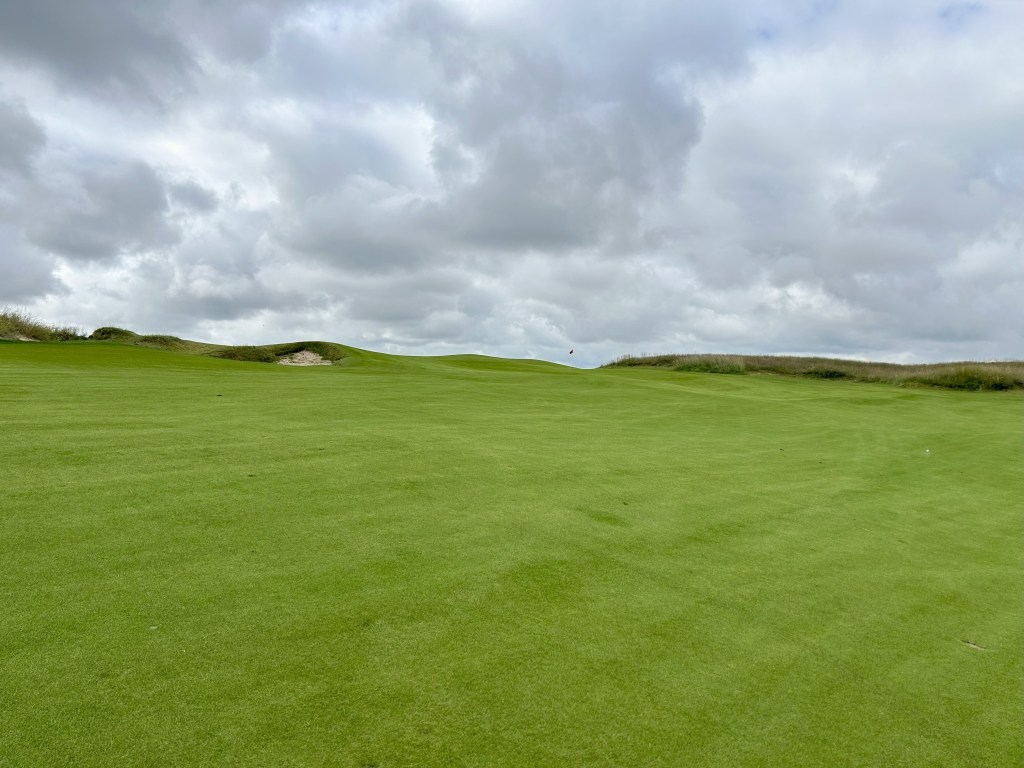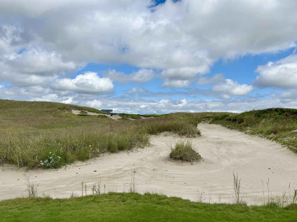 Thirteen is a shortish par four at just 350+ yards. There is sand to the right that you can’t really see from the tee box beyond the fescue.