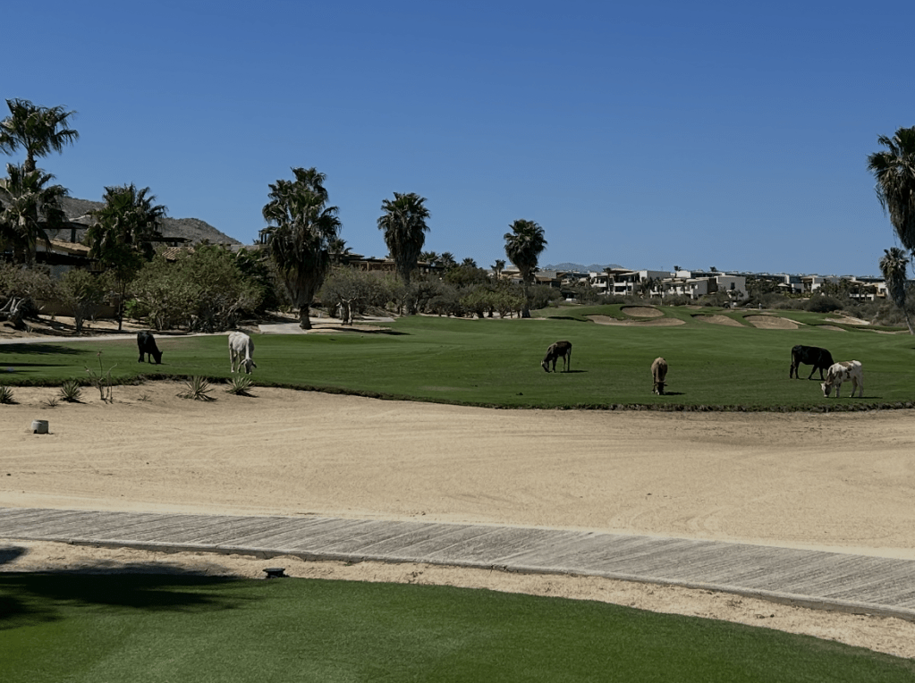 Yes those are cows (vacas) grazing out on the fairway. I guess that’s one way to approach turf management.