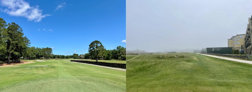 Thirteen is the replica Road Hole 17th at St. Andrews. While accurate design-wise, you need the barn wall to truly replicate the hole. Not sure they should’ve tried this one but a fun hole because you can bite off the wall versus going over the barn wall. Below is my side-by-side with original St. Andrews 17th photo. I’ll give you this though, the day was so much nicer in central Florida.