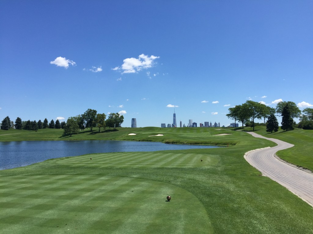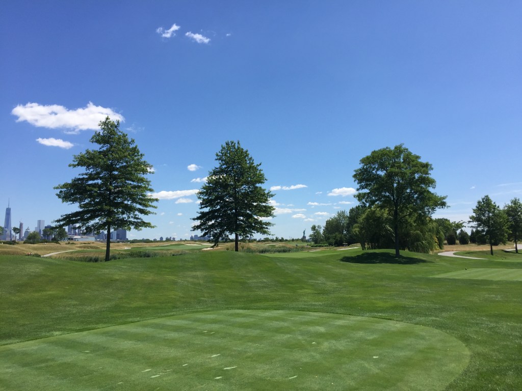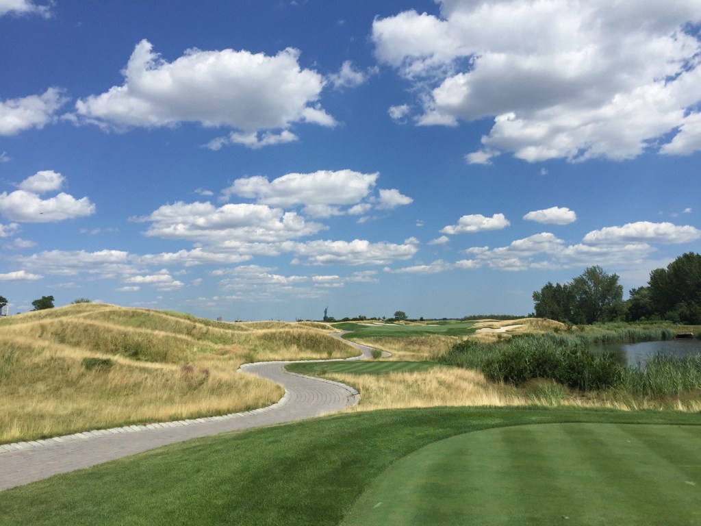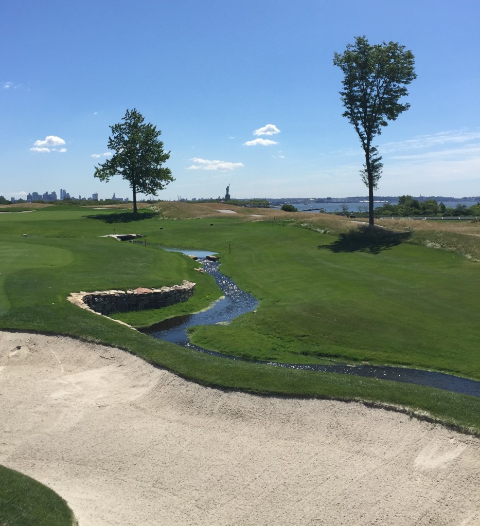 The course? It’s a great first hole here, a dogleg right with a creek running along the right-hand side. A great opener. The ninth hole is one of my favorites here with the Statue of Liberty as a backdrop. One of the great halfway houses in golf greets you at the turn. Seventeen again uses the Statue of Liberty as a backdrop and the 18th above definitely ranks in my top finishing holes in golf.
