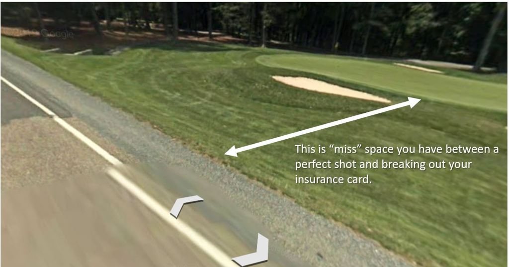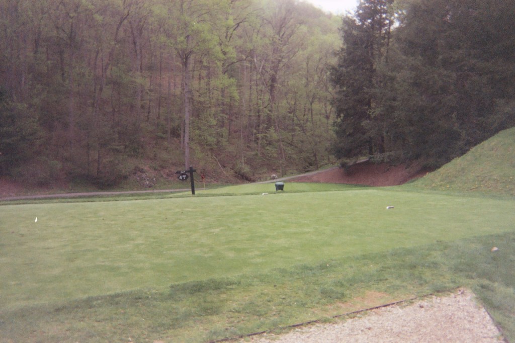 To the course. Cascades is a William Flynn design. Flynn is the quintessential Philadelphia golf course architect. The dude has his name on some pretty impressive tracks: an assist on Merion, Shinnecock, the Country Club (Mass), solo credit at Cherry Hills and here among others. He also designed a few lesser known Philly classics like Manufacturer’s and Lancaster. All good stuff. Flynn also has some really bad swings-and-misses. He designed the “Fredo” courses at Merion and Seaview. He put his name on McCall Field. So when I teed it up on one at Cascades all I can remember is “eww, this sucks.” Well I also remember having a really good bloody – the guys at the course were amazing. More on that later. But the first hole was a yawn. Then the approach had to negotiate the busiest road in Hot Springs. From Google Earth, look at how close you are to the road if you miss the green left.