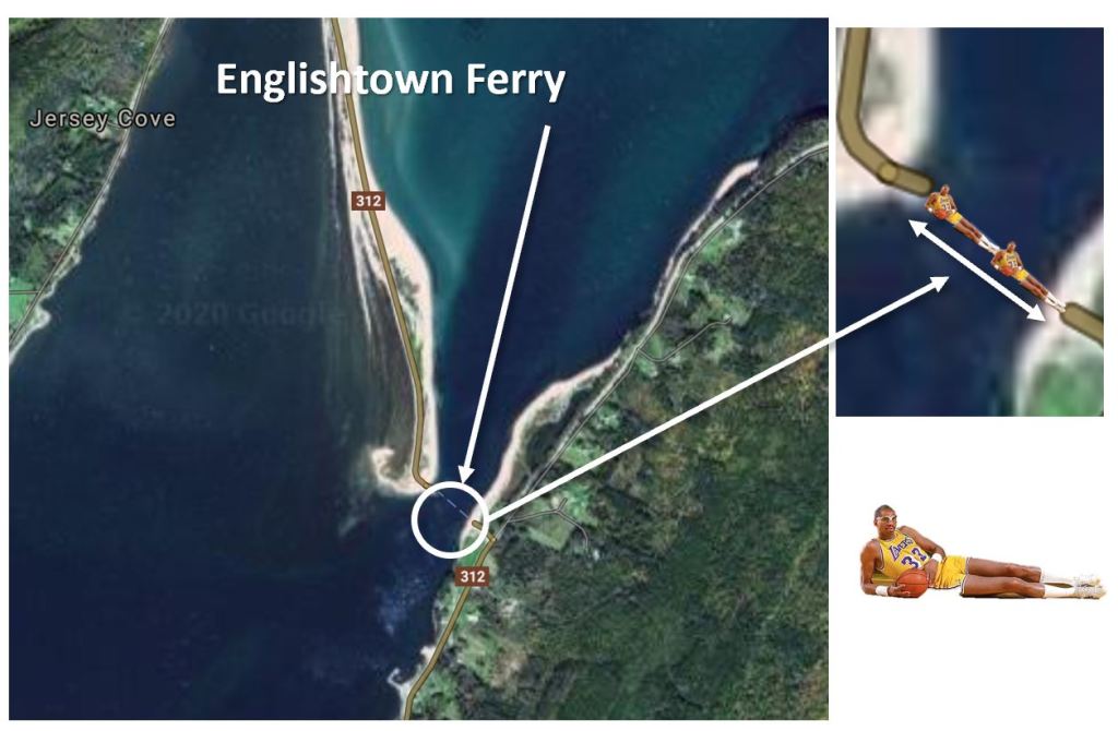So we all met from the various parts of the US in Sydney then drove right to Highlands from there in the morning. If you do the same, there’s a fun little course in Sydney called Seaview that makes for a great warm up round. For the drive, you should come up to this little ferry. It fits about three cars and travels only about two Kareem Abdul Jabbars. See the “drawn to scale” image below.