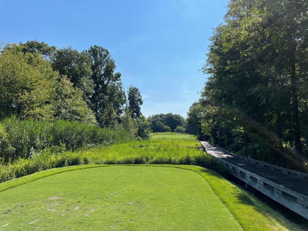 The 18th is one of the toughest finishers you will ever encounter, regardless of skill. An environmental wetland area prevents big hitters from uncorking the driver – so man and beast alike are hitting 220-185 over the wetlands into a severely sloping back to front green protected by bunkers on either side. Other favorites include four (a 350-yard par four) where you need to cross a creek to hit the fairway with water left and OB right. Then back over the water on the approach. Again, the design keeps big hitters from using the driver. The back nine moves away from the office park and into the wetlands. Every hole is a challenge on the back and you best pack an extra sleeve of golf balls.