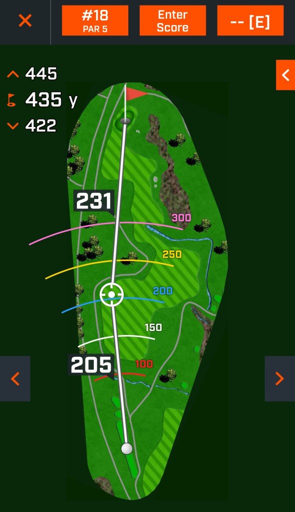 Four from the fairway. The photo does not do justice to how far up hill this is. See the little creek at the foot of the hill? Knowing I had a 200-yard approach to an uphill green that I don’t have, I tried to lay up but hit it flush right into the creek. Drop. Over club to make sure I don’t come back down the hill. Poor chip to the fringe. At least I only two-putted from there.