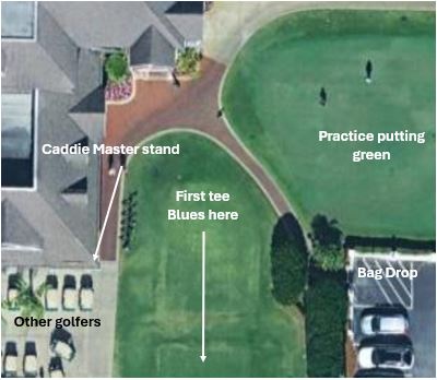 Two coming back toward the clubhouse. My approach shot? Nope this is my punch out result. I did get on and close but missed the par putt. Greens and fairways were in better shape than this photo suggests. Just 321 yards from the blues.