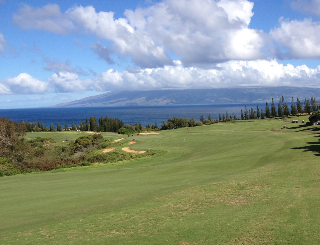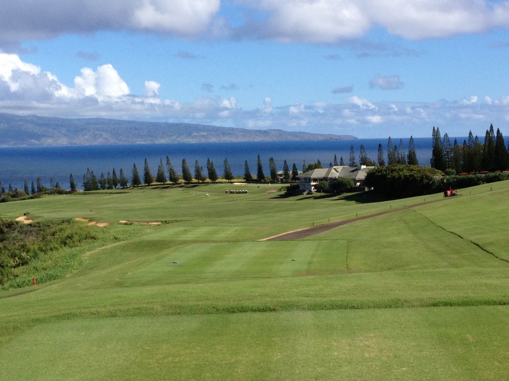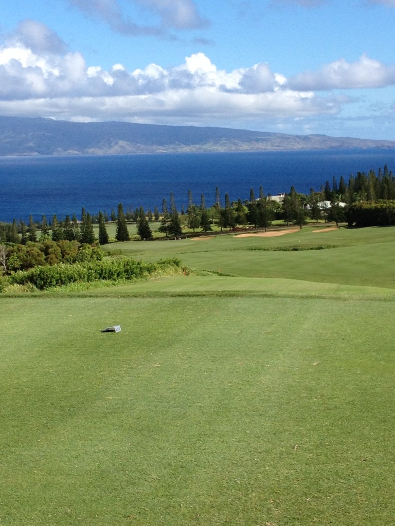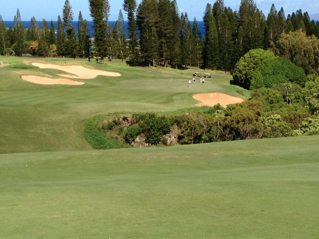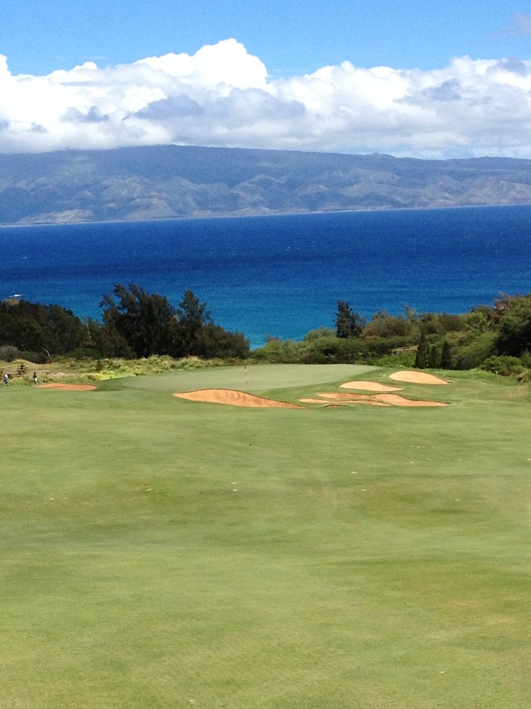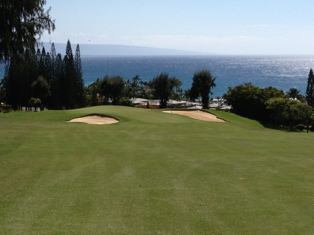 They say that TV doesn’t do justice to how hilly Augusta is. I will tell you though watching the pros at Kapalua you can tell it’s pretty hilly and when you get here, times that by ten. There was a hole on the back where I literally had my back to the hole to putt and still didn’t read enough break. Played here in 2013. Conference golf outing. It was a shotgun start but started on one and glad we did as it is one of the best opening holes in golf. Above is the approach after what was easily a severely downhill-aided 300+ yard drive. Kapalua is a Coore/Crenshaw design that is all about the wow factor – ocean views, dramatic slopes, intriguing holes.