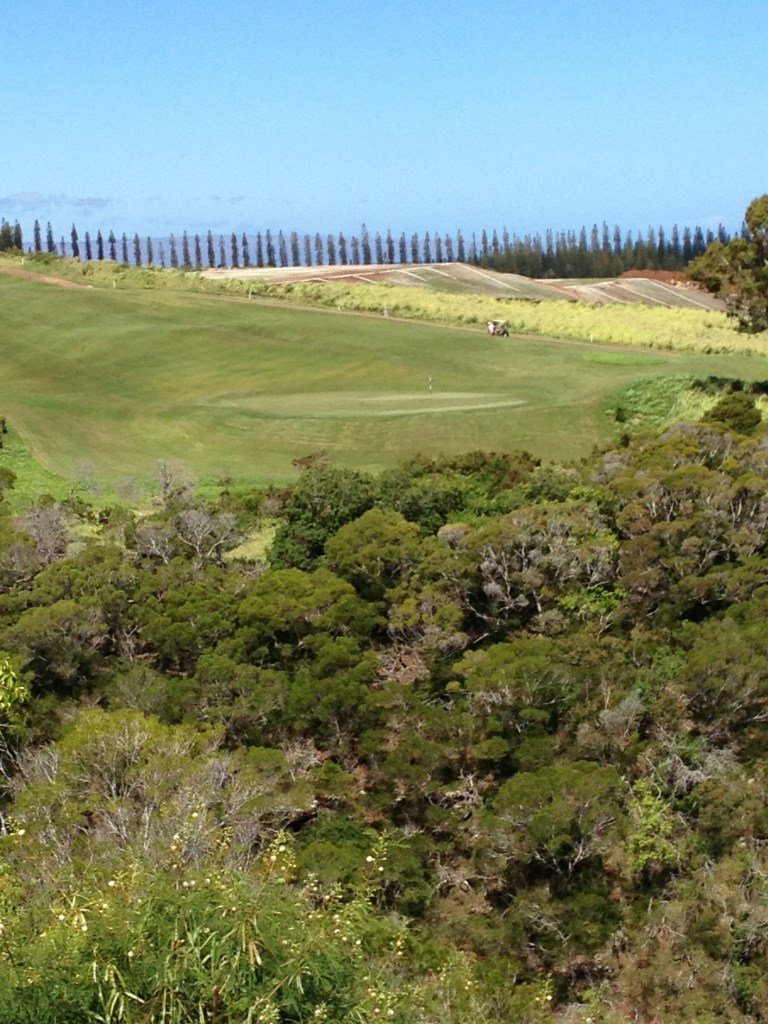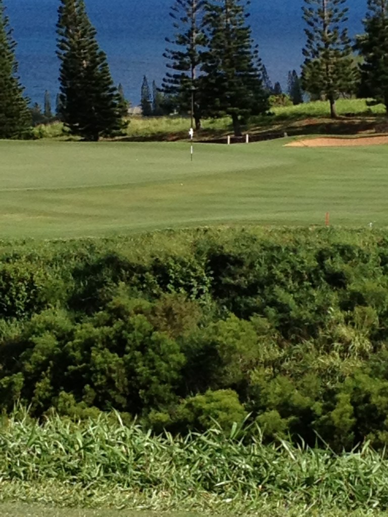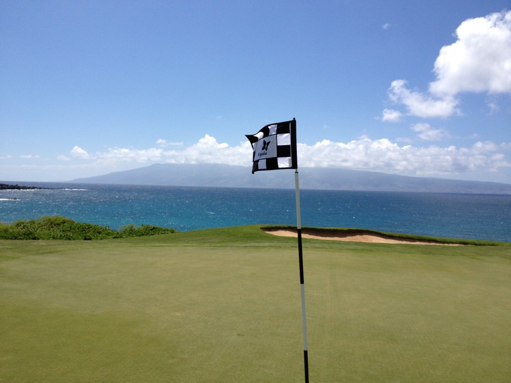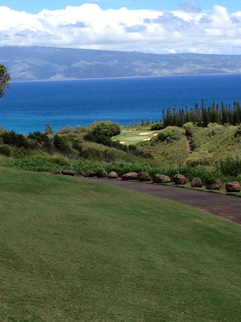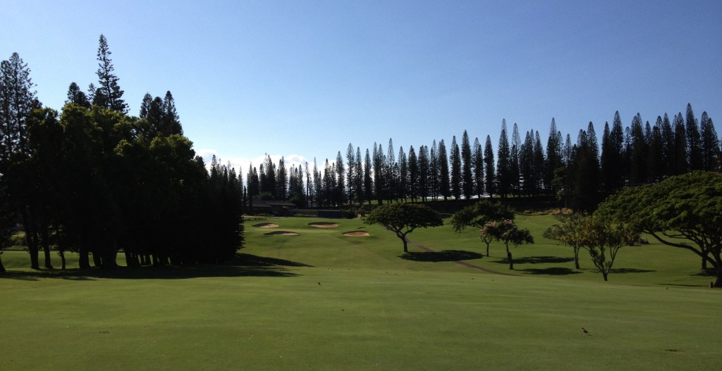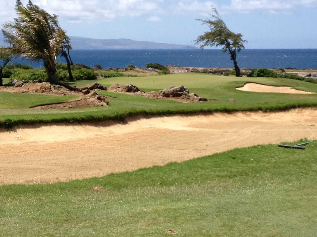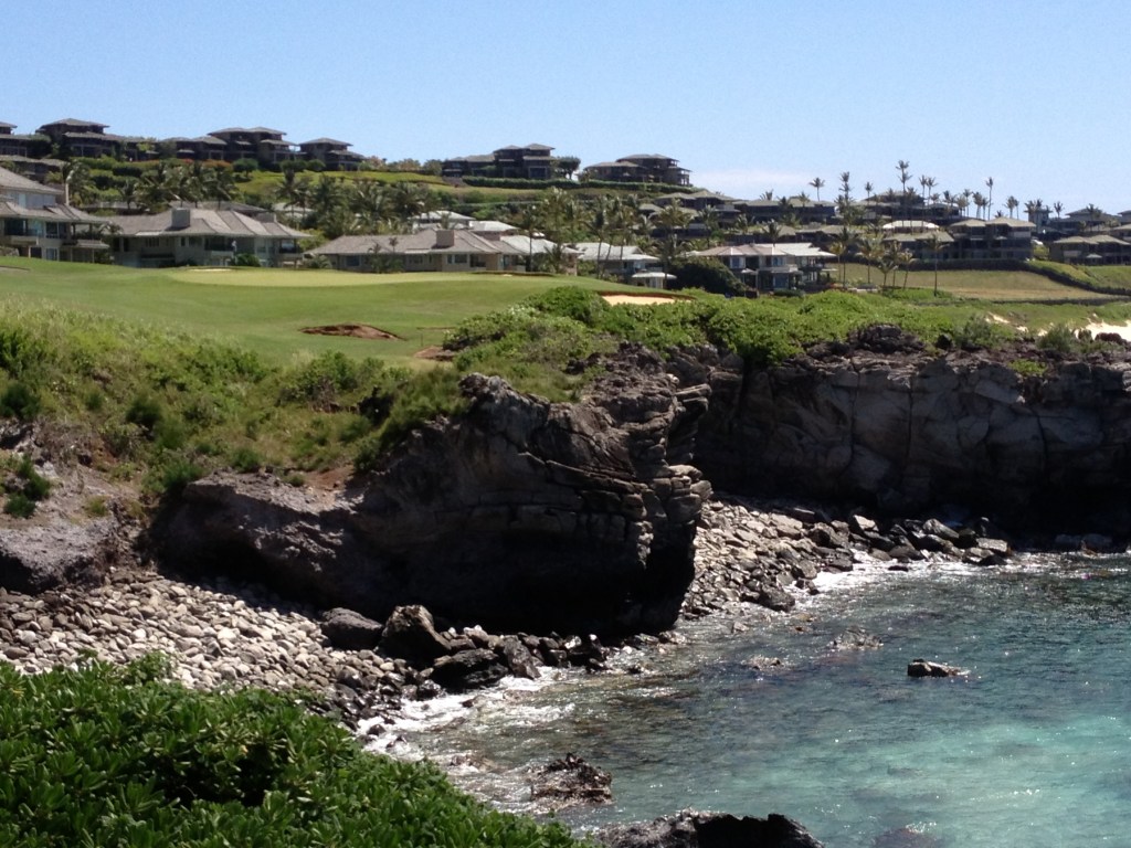 They say that TV doesn’t do justice to how hilly Augusta is. I will tell you though watching the pros at Kapalua you can tell it’s pretty hilly and when you get here, times that by ten. There was a hole on the back where I literally had my back to the hole to putt and still didn’t read enough break. Played here in 2013. Conference golf outing. It was a shotgun start but started on one and glad we did as it is one of the best opening holes in golf. Above is the approach after what was easily a severely downhill-aided 300+ yard drive. Kapalua is a Coore/Crenshaw design that is all about the wow factor – ocean views, dramatic slopes, intriguing holes.