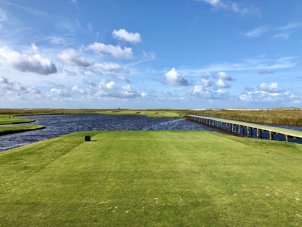 The seventh is one of my favorite holes on the course as it comes back in front of the clubhouse (almost like a finishing hole). You’ll need to deal with the mopey birdwatchers on seven. Eleven is a par three where you are in the marsh and need to cross about a three-foot-wide bridge to get to the green. Man, if you’re boozed up on this, I can imagine you’d plunk your ass right into the pond here. From there the final holes play around the lighthouse up closer to the water’s edge (the photo above is another favorite of mine the 12th). Sixteen is another favorite as it plays out to a point right to the beach. The two finishing holes are where you’ll encounter the first true dunes on the course, hugging the right side of the holes. What I remember about my own play here is that I was in the sand. A lot! And couldn’t get out. Not sure if there is a lot of sand on the course or whether my ball just found every bit of it on the course.