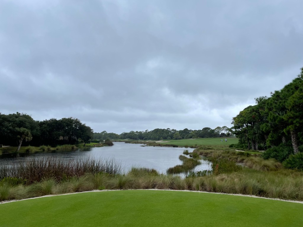 To the course. So it was raining and had been raining for about 24 or so hours. However, the course drained and was in great shape. The greens were still sneaky fast. We played the 6,400 yard tees which played super long because of the rain. The first hole is the #5 handicap so it is no push over. Harder still most of the holes on the front feature water hazards or other schmeggies you had to carry or otherwise avoid. The first didn’t but is a slight dogleg with a fairway bunker that protects the slight dogleg. It is a pretty easy carry, though. Two is a mid-length par three. Three is a very intimidating drive and equally intimidating approach with water all along the left. Five was another favorite hole – a shortish par four with a great approach over some schmeggies. And the number one handicap sixth is just a lengthy beast with sand all along the left and surrounding the green.