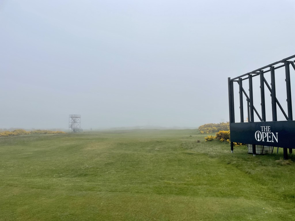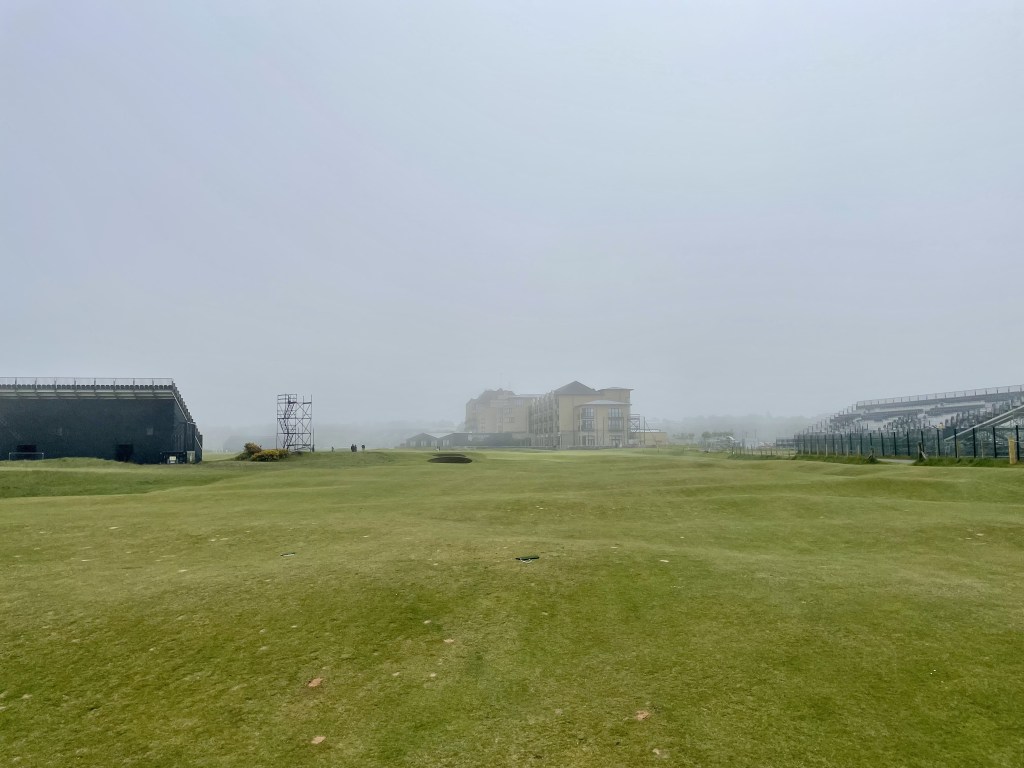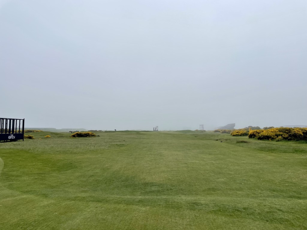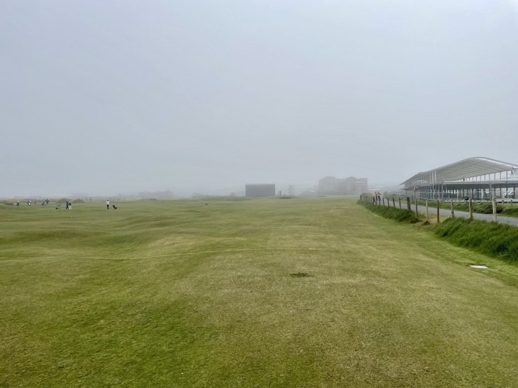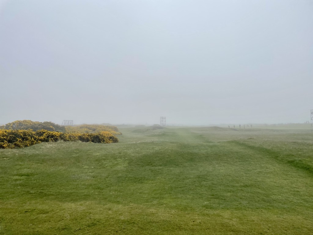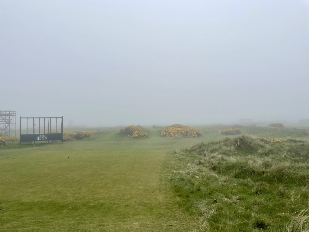 To the course. As you’ll see from the photos, they had the stands up for the upcoming 150th Open. This actually gave us aiming directions in the fog! My buddy said he was pretty nervous on the first tee. Funny, I wasn’t at all. It’s like a driving range and was able to play a nice fade to the right side of our fairway. We played the blues which measure about 6,400 yards. The first is a 355-yarder so I has a decent drive (for me) and about 130 or so left. There is not a lot of room behind the blue tee so the pros are probably only playing this another 25 yards or so. For a lot of the holes, the tips aren’t way far back so I’m surprised they don’t kill this course (Zach Johnson won it at -15 the last time they played here). But again I played with no wind.