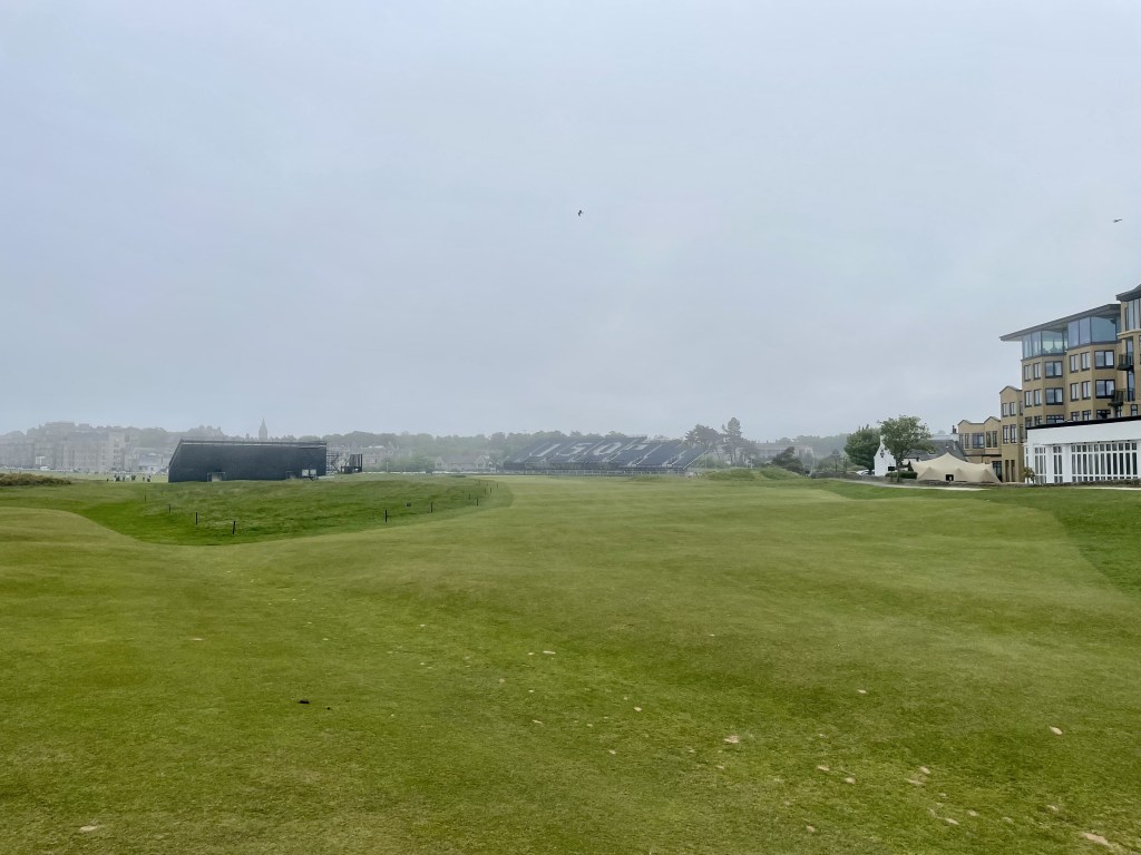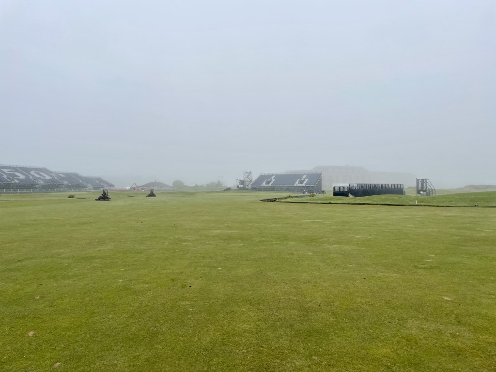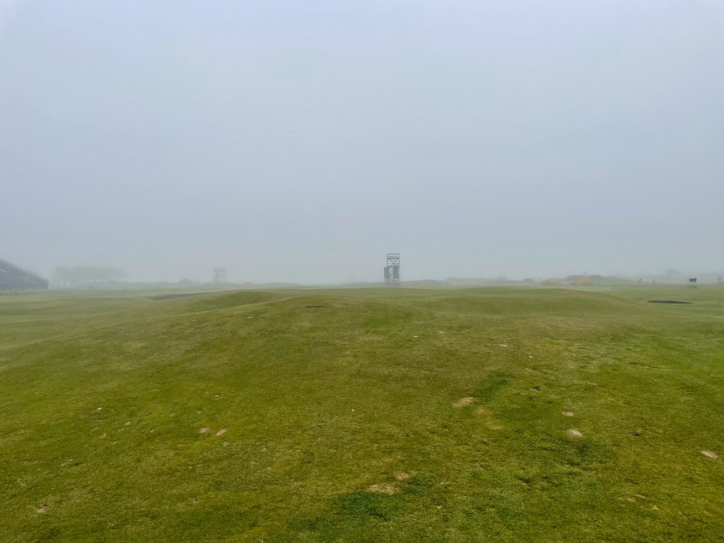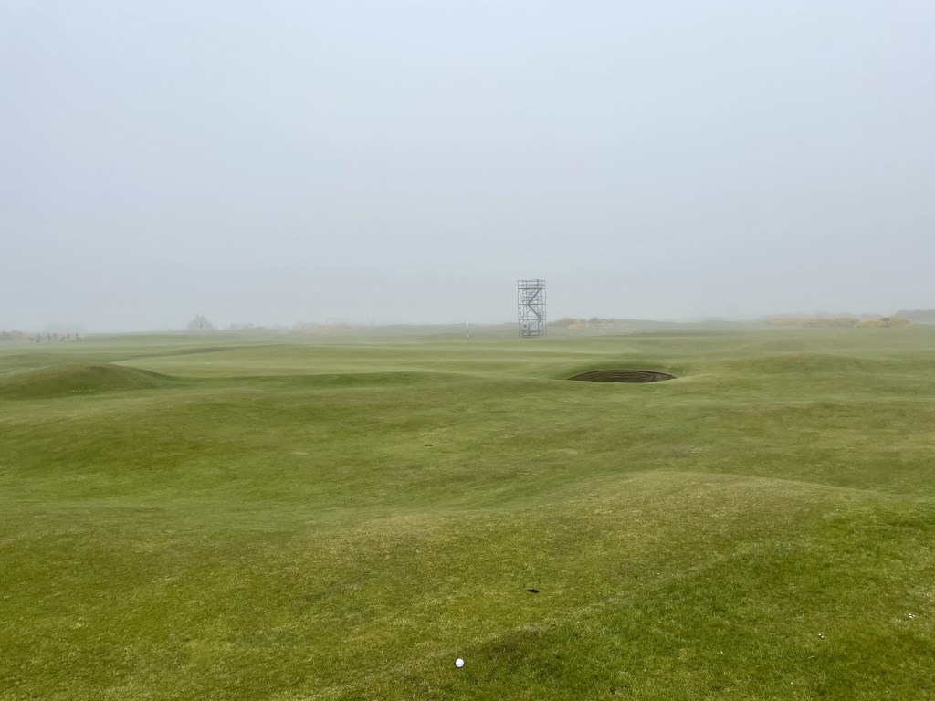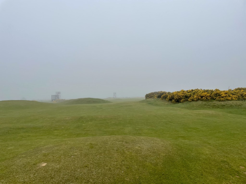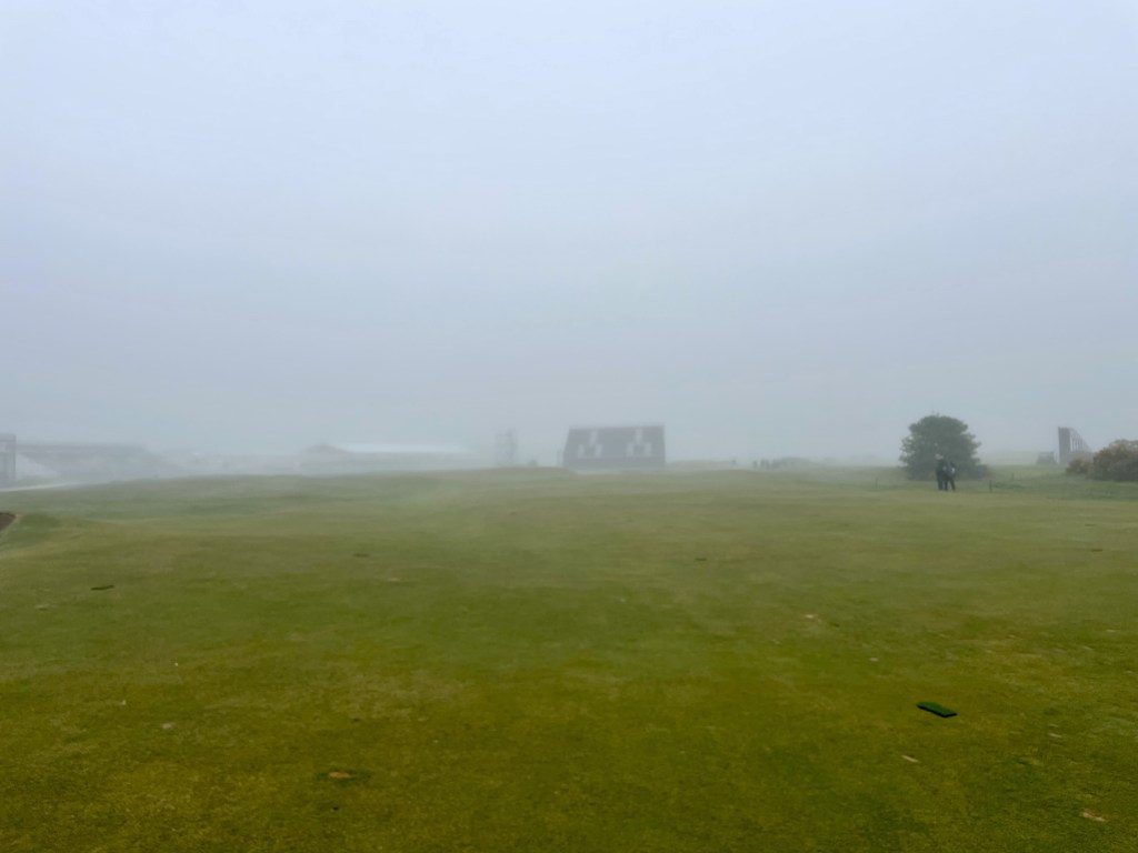 To the course. As you’ll see from the photos, they had the stands up for the upcoming 150th Open. This actually gave us aiming directions in the fog! My buddy said he was pretty nervous on the first tee. Funny, I wasn’t at all. It’s like a driving range and was able to play a nice fade to the right side of our fairway. We played the blues which measure about 6,400 yards. The first is a 355-yarder so I has a decent drive (for me) and about 130 or so left. There is not a lot of room behind the blue tee so the pros are probably only playing this another 25 yards or so. For a lot of the holes, the tips aren’t way far back so I’m surprised they don’t kill this course (Zach Johnson won it at -15 the last time they played here). But again I played with no wind.