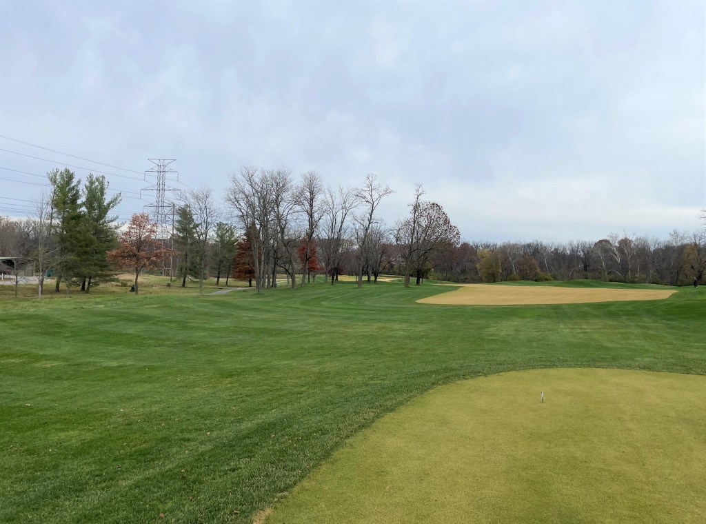 Seventeen. 360-yard par four. What you can’t see is the bunker to the right. I found it. Surprise. Decent shot out. Chip on and two-putt bogey.